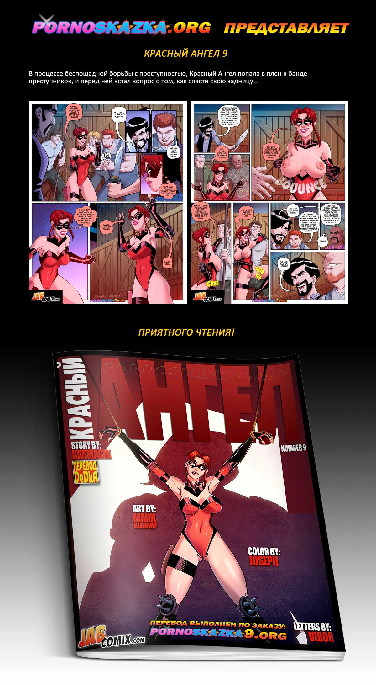 Порно комикс «Красный ангел. Часть 9». В процессе беспощадной борьбы с преступностью, Красный Ангел попала в плен к банде преступников, и перед ней встал вопрос о том, как спасти свою задницу…